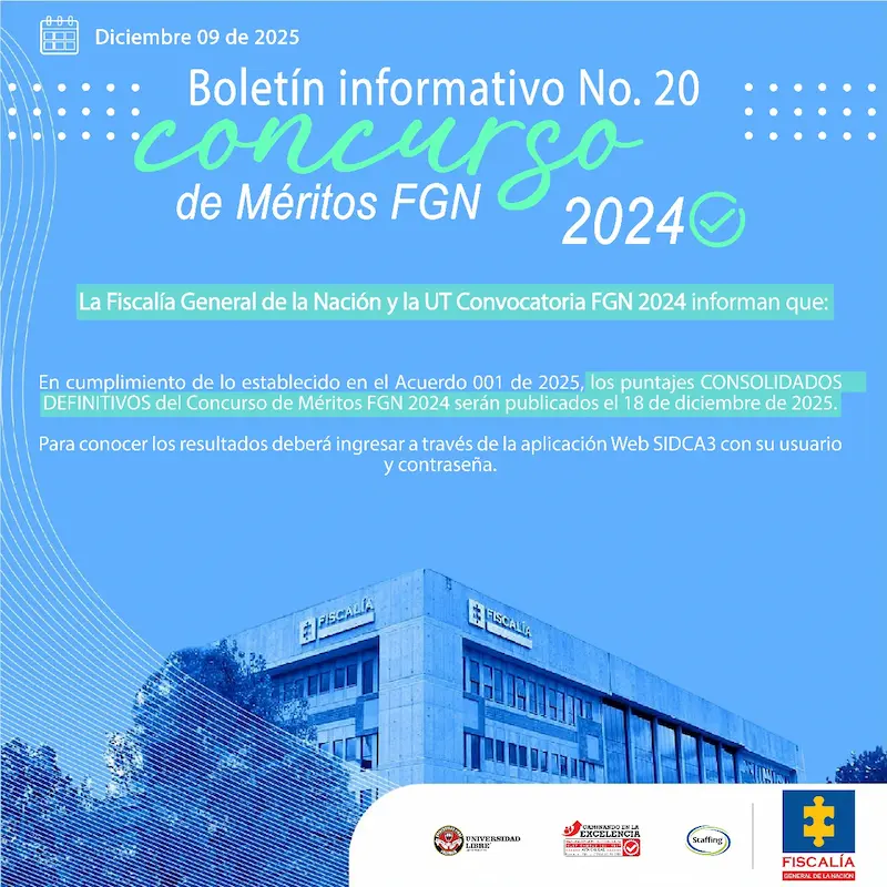 Por lo anterior, se publica el citado fallo de tutela, con el fin de notificarlo a los aspirantes al concurso de méritos adelantado por la UT CONVOCATORIA FGN 2024-UNIVERSIDAD LIBRE “SIDCA3”- FISCALÍA GENERAL DE LA NACIÓN para el empleo Código I-105-M-02-(1), Profesional Experto.