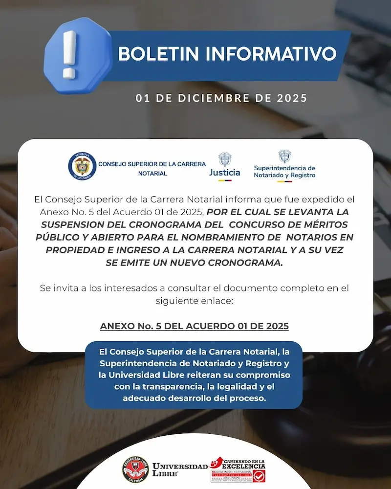 DescargarSe informa que el JUZGADO CUARENTA y CUATRO CIVIL DEL CIRCUITO DE BOGOTÁ, en conocimiento de la acción de tutela, interpuesta por el señor ELKIN YESID MOLINA OROZCO, identificado con la C.C. No. 1053821495, mediante auto de fecha 01 de octubre de 2025, ordena publicar el auto admisorio y el escrito de tutela, con el propósito de darles a conocer la existencia de este trámite, a terceros con interés legítimo en el Concurso de Mérito Notariado.